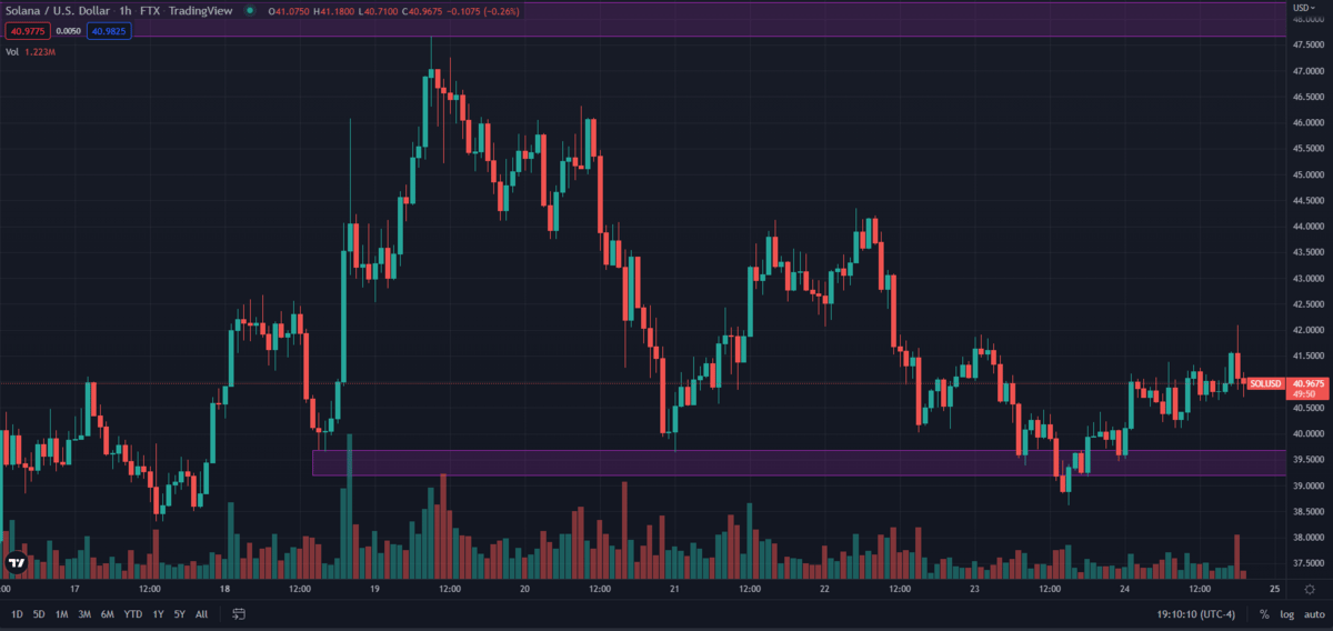 SOL was able to break through the $42 supply zone this week. SOL may be chopping in a new range between $39 and $49. One way to think about crypto is to consider supply and demand. Supply is the top purple box; this is where many people have sell orders. The bottom purple box is the demand zone where many people have buy orders set. You can see these areas because when price hits them, buy or sell orders are triggered, and the value bounces off in the other direction if these zones are tagged enough times; that is where you can see a breakout happen because enough of the orders were filled.