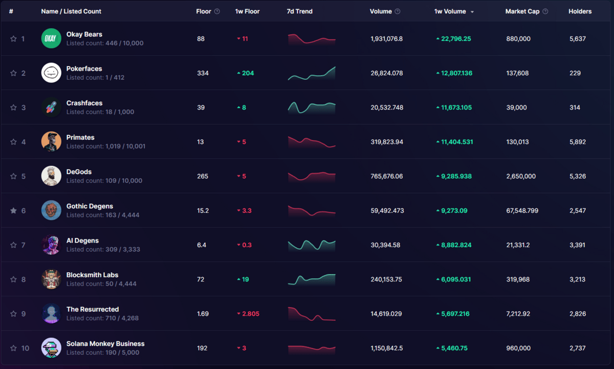 Trending projects on Solsniper show Okay Bears taking the top spot with Pokerfaces and Crashfaces filling the second and third spots, respectively. Gambling meta lives for yet another week.