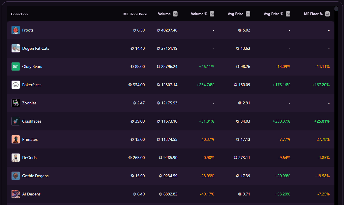 Magic Eden 7D volume shows some of the newly minted projects in the top 10, including Froots, Degen Fat Cats, and Zoonies. Zoonies was the first Solana-based project to launch on Open Sea's upcoming launchpad.